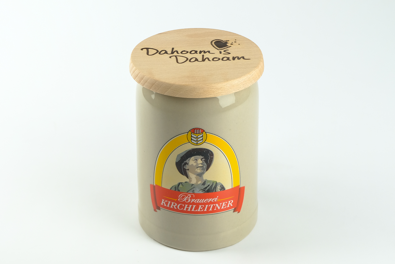 Fanset "Kirchleitner Steinkrug (0,5 Liter) + Glasabdecker ais Holz mit gelaserten DiD-Schriftzug"
